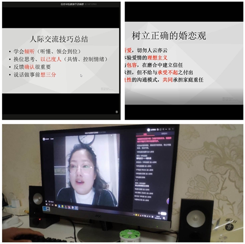 组织广大师生开展线上心理辅导讲座。主讲人为国家二级心理咨询师、学工办辅导员胡迪老师。共有269名师生加入课程直播间。讲座主要从“疫情期间如何调试心理、如何应对人际关系困惑和如何树立,正确的婚恋观”三个方面进行。同学们纷纷通过课程直播间留言提问等方式交流内心想法、疏导内心烦闷,为返校学习调整到了最佳心理状态。
