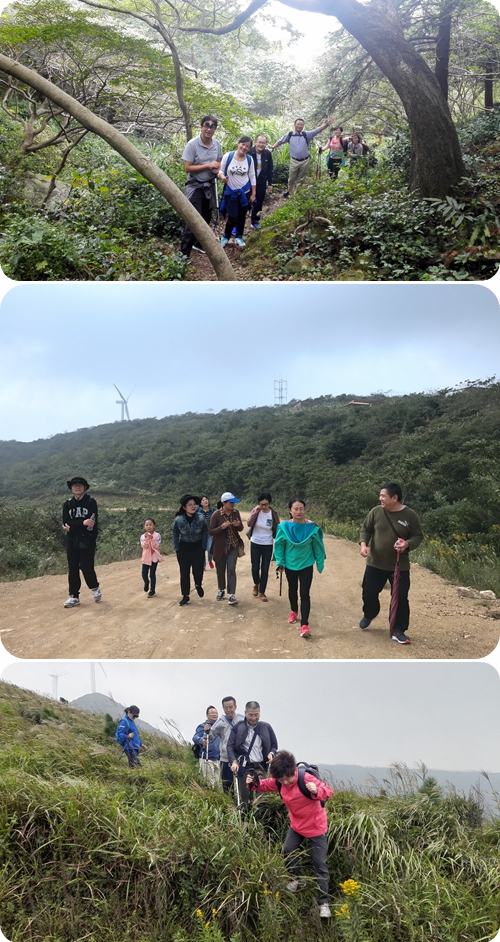 从虾蜡村村口下车,教工们穿过村向山里走,首先看到的山脚下的长流水水库,水库的取名长流水,寓意深长。根据上山的指路牌,从水库边开始上山,上山的路是北仑区特色的游步道,踏着水泥台阶,如逛公园。游步道一直修到了龙潭,龙潭像两道小瀑布。从龙潭往上走, 顺着山道,一步一级的,来到一片茶园的边上,有一间石垒的屋子,屋子外有两张小石桌和一些石凳,是个可供登山者们休息的地方。短暂休息后,按着石屋外的手绘地图的指示往上走,一直走到山脊处的公路上。山上有一个风力发电站, 山上的风是很大。沿着山脊的公路走,很快就看到很大一片芦苇丛,大风吹得芦苇摇摇摆摆,芦花开得最盛的时候已过去了。放眼望去,满眼看到的是黄绒绒的芦苇杆。 大家穿过这一大片的芦苇地再登上北面的山峰,只进入芦苇丛转了一圈后又回到公路上,沿公路东行稍稍折回些就顺着一小路往下走回到半山腰的石屋后,我们原路返回到虾辣村口。