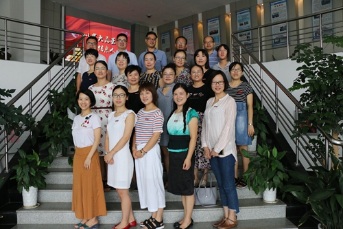 的教工们率先从行政人员开始,互相佩戴了校徽,在一楼大厅举行以“以宁大为荣 展信息人风采”为主题的校徽佩戴仪式。