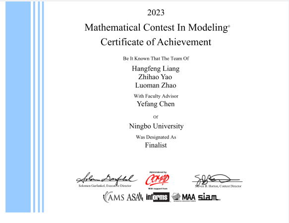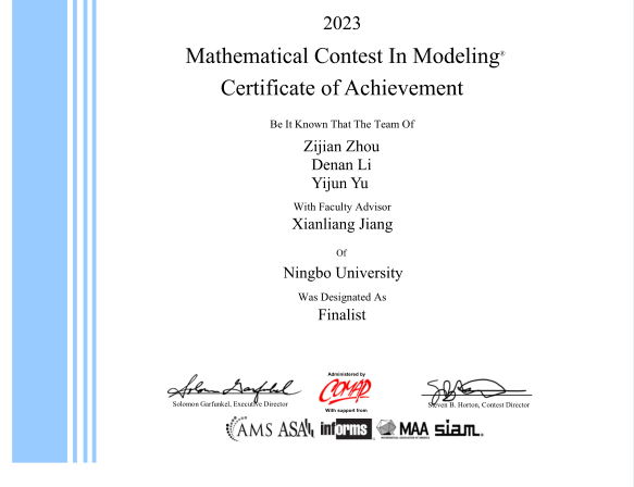 学子表现突出获得F奖(Finalist)3项,M奖(Meritorious Winner)2项,H奖(Honorable Mention)10项。 其中,获得F奖的分别为赵杰煜、陈瑜老师指导的由潘奕、张朝海、周华建组成的团队,江先亮老师指导的周子建、李德楠、余亦骏组成的团队,陈叶芳老师指导的梁航锋、姚志昊、赵罗曼组成的团队。