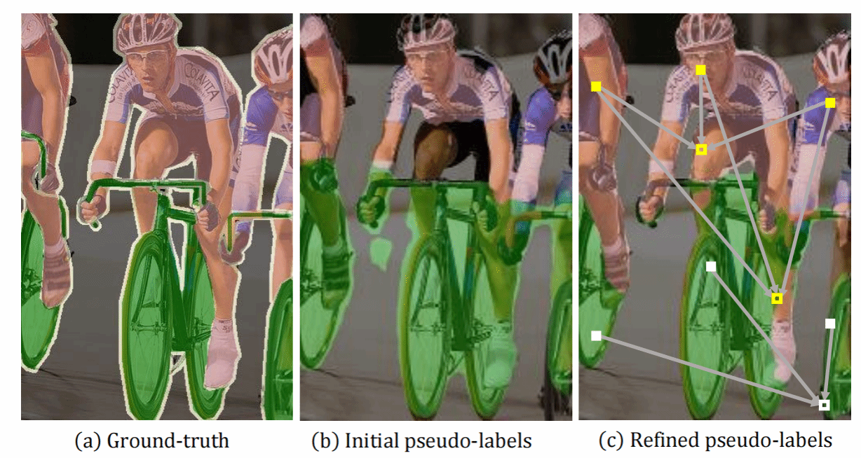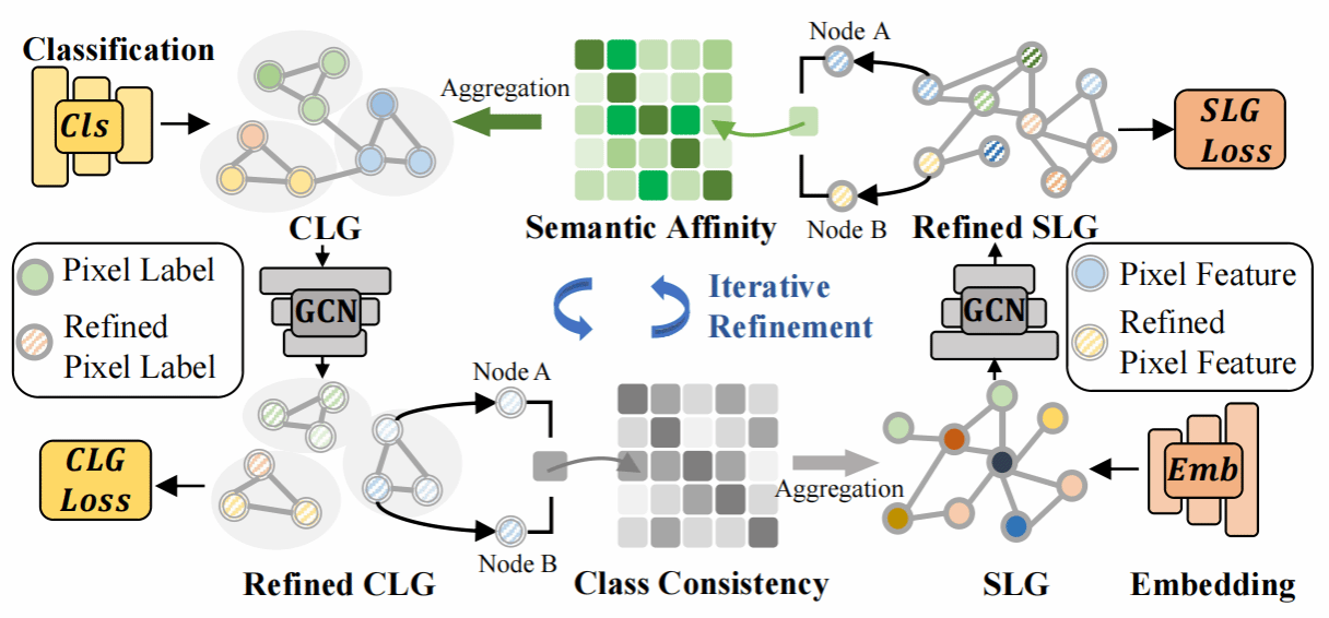 半监督语义分割通过利用未标记数据减轻了对大规模标记数据的依赖。最近的半监督语义分割方法主要采用伪标记方法来利用未标记的数据。然而,不可靠的伪标签可能会破坏半监督过程。我们提出了一种称为多级标签校正的算法,旨在使用图神经网络捕获语义级图和类级图中的结构关系,以纠正错误的伪标签。在图结构化的近似信息的支持下,本方法可以纠正错误预测的伪标签,并可以促进特征的差异化表示。相关论文发表在IEEE Transactions on Multimedia,Knowledge-Based Systems,Neurocomputing等期刊。