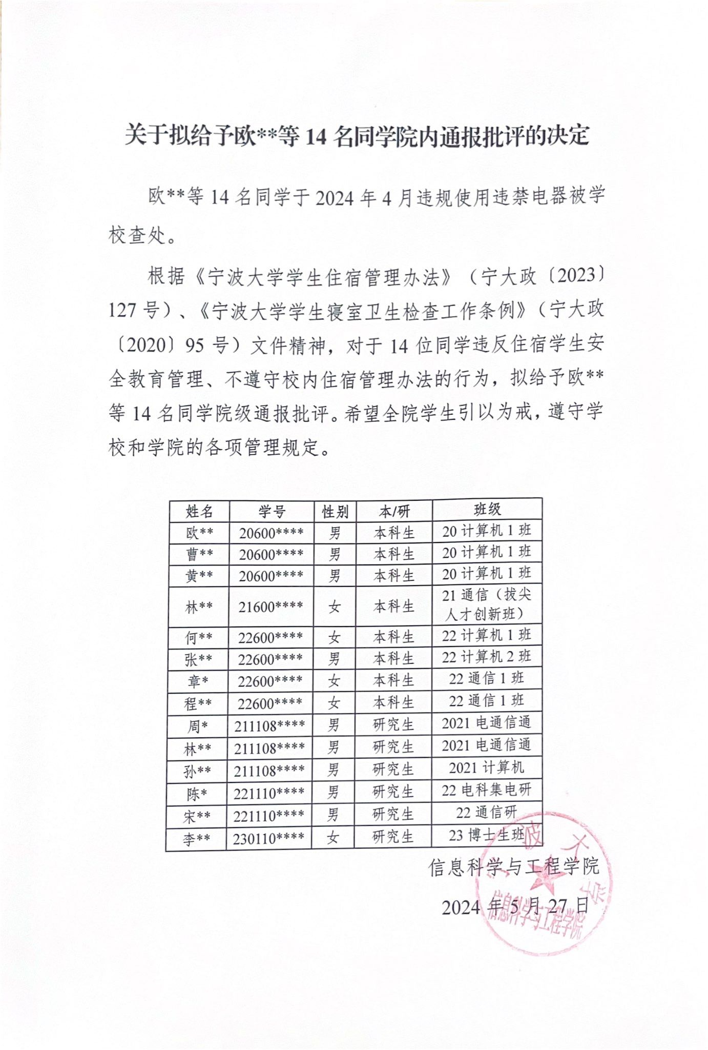 关于拟给予欧**等14名同抖音黑料 内通报批评的决定
