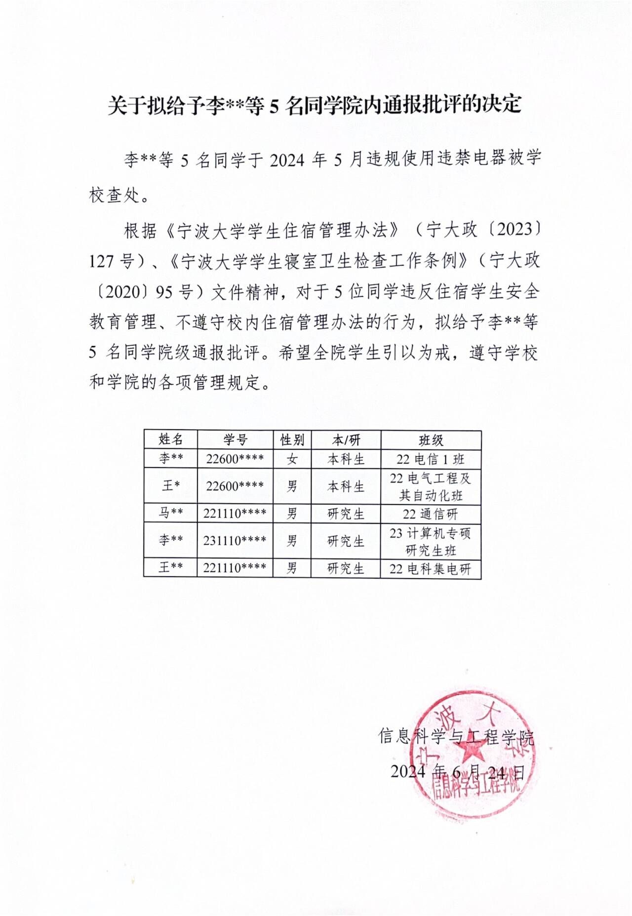 关于拟给予李**等5名同抖音黑料 内通报批评的决定