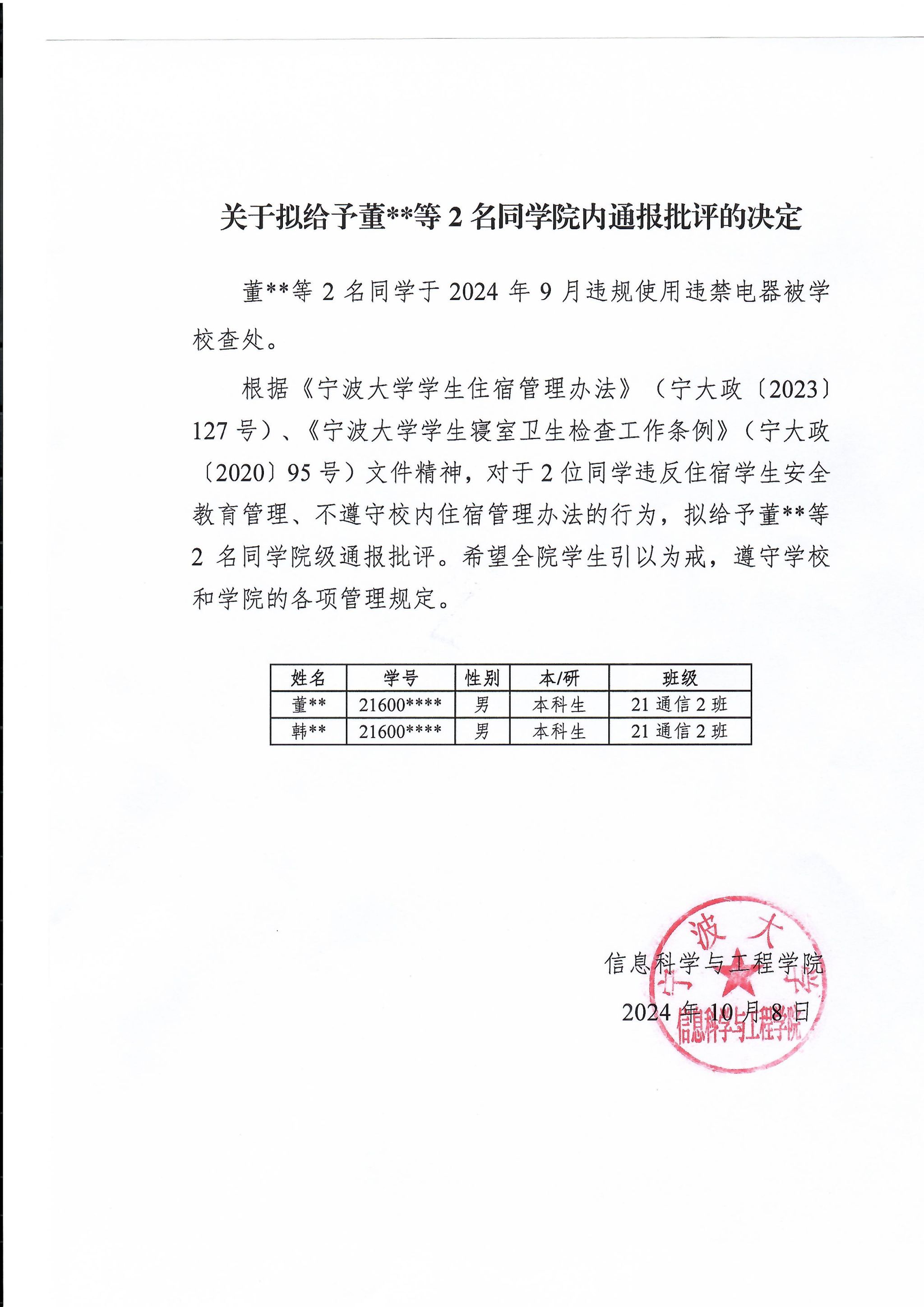 关于拟给予董**等2名同抖音黑料 内通报批评的决定