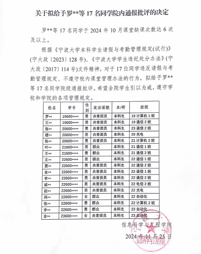 关于拟给予罗**等17名同抖音黑料 内通报批评的决定
