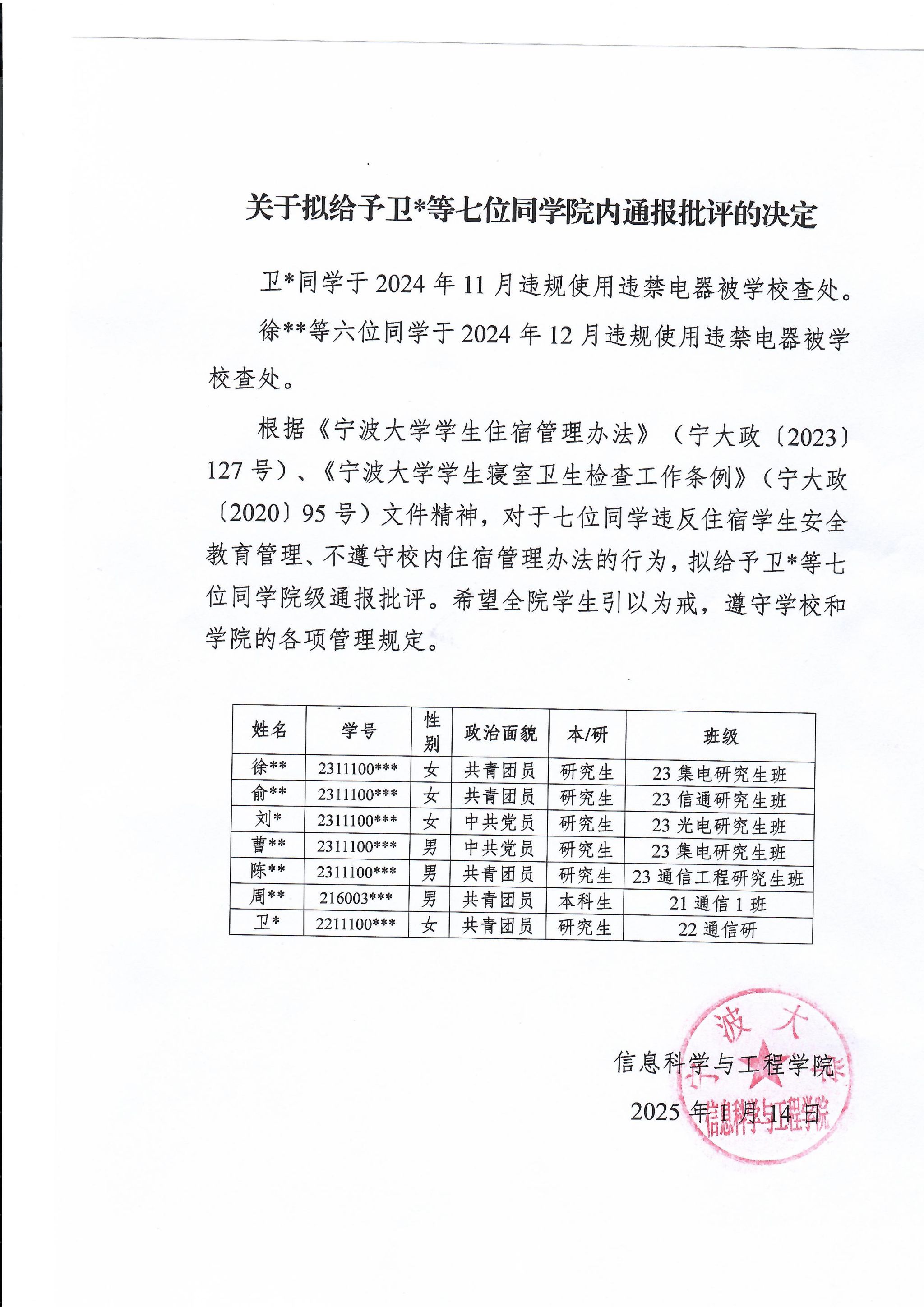 关于拟给予卫**等七位同抖音黑料 内通报批评的决定