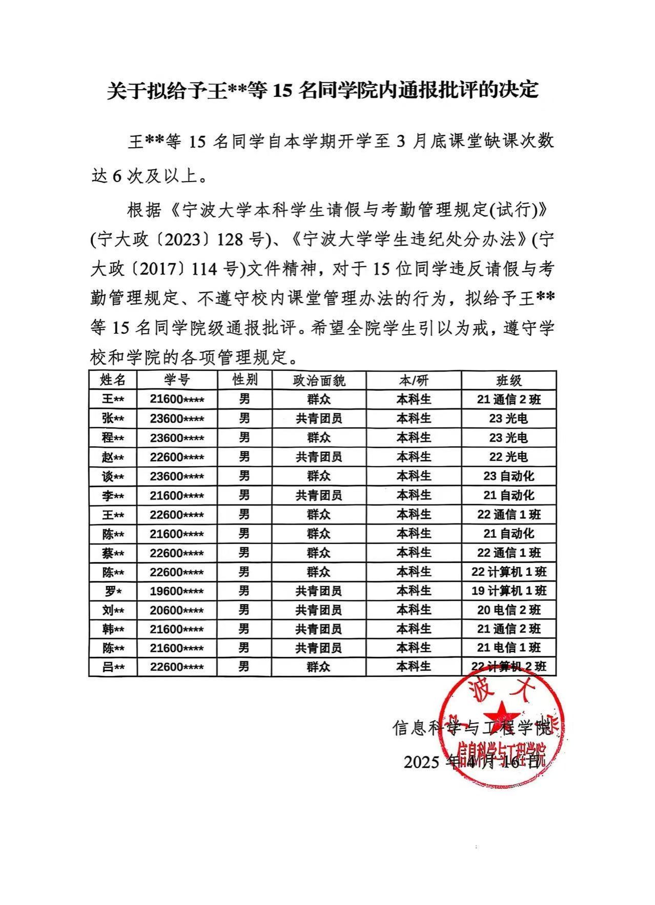 关于拟给予王**等15名同抖音黑料 内通报批评的决定