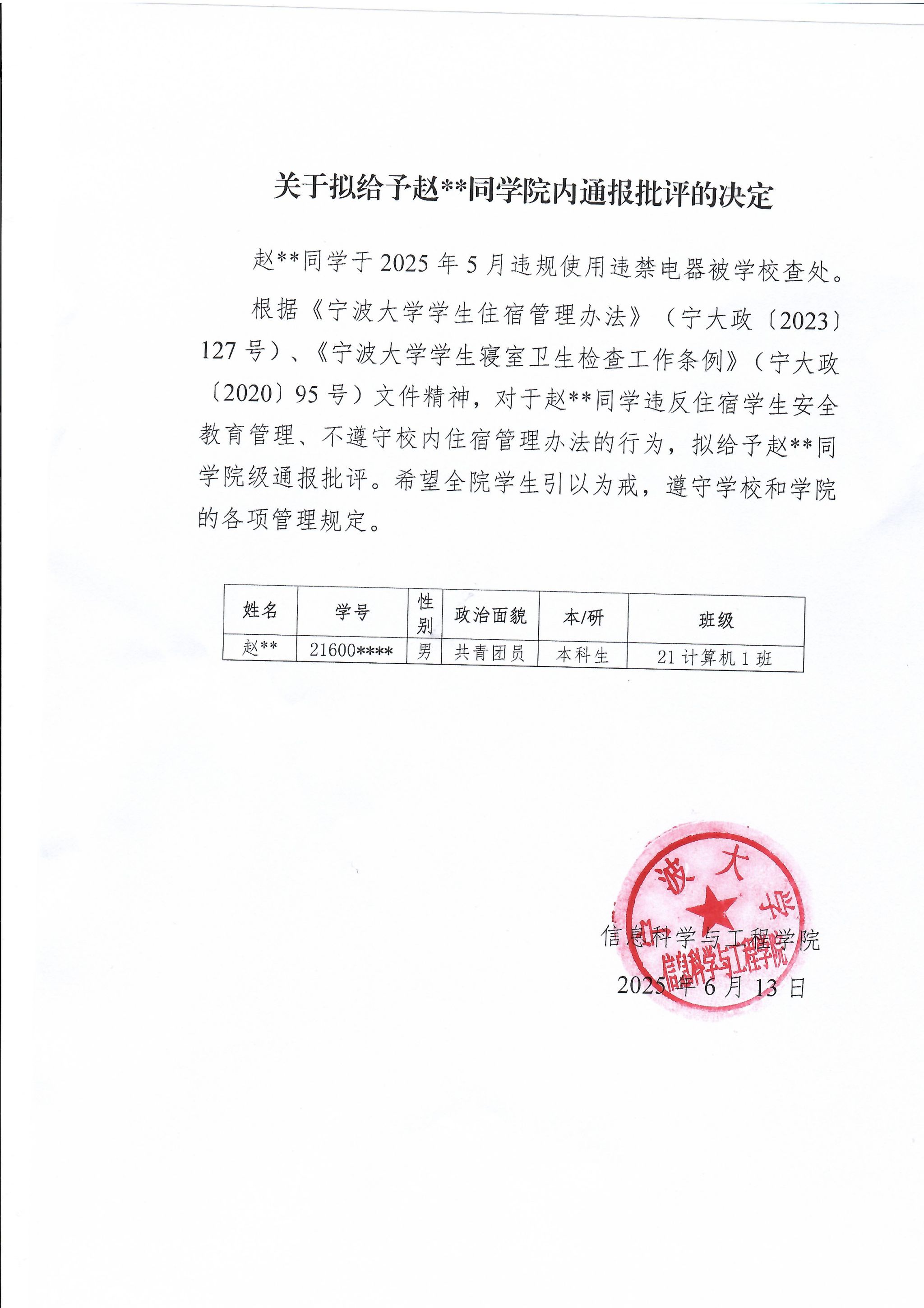 关于拟给予赵XX同抖音黑料 内通报批评的决定