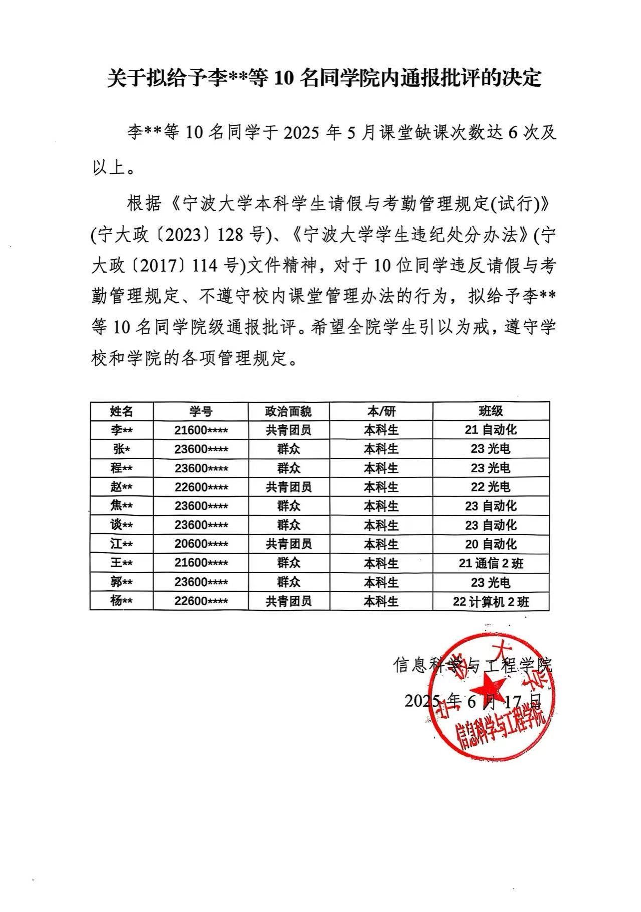 关于拟给予李**等10名同抖音黑料 内通报批评的决定
