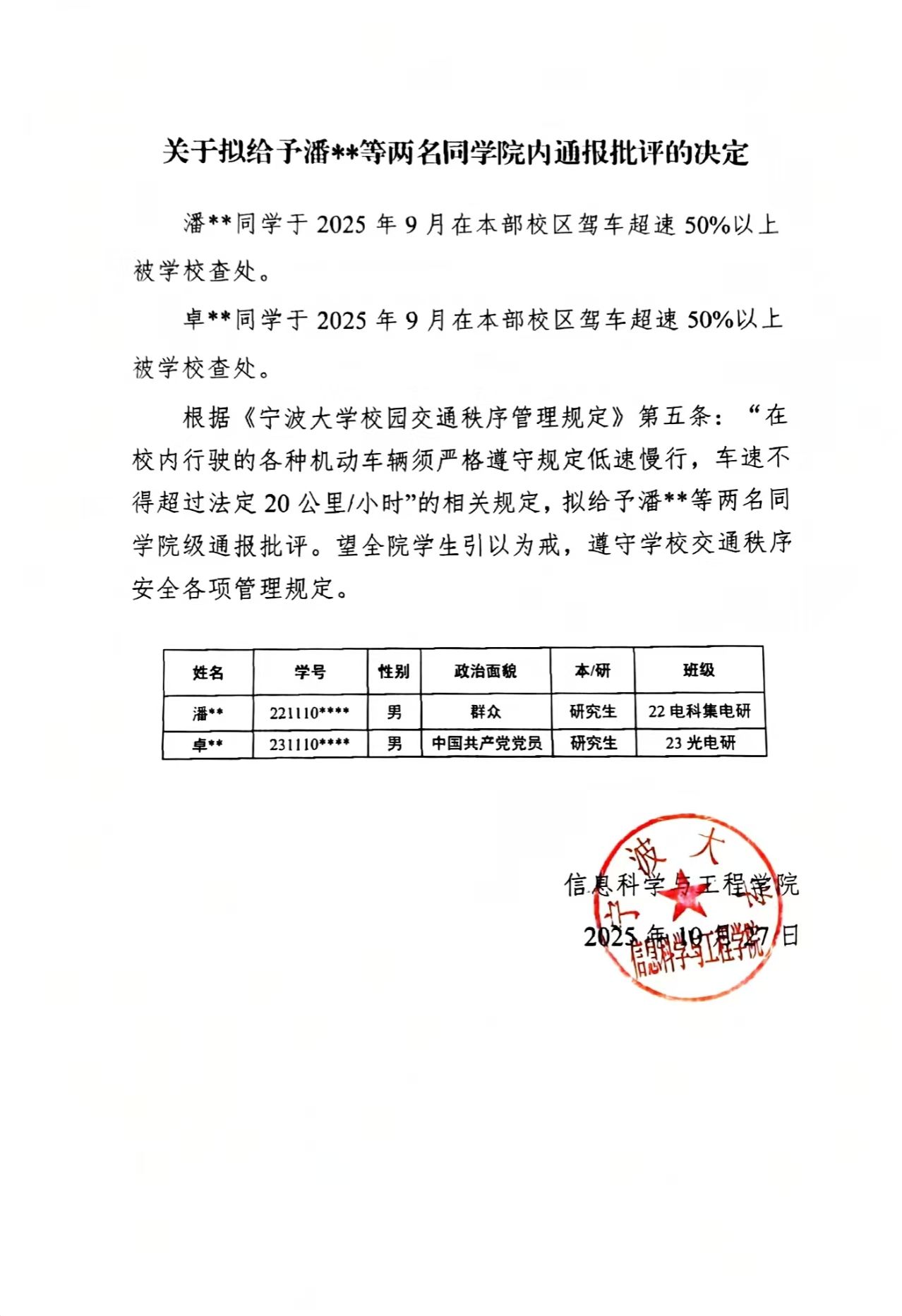 关于拟给予潘**等两名同抖音黑料 内通报批评的决定