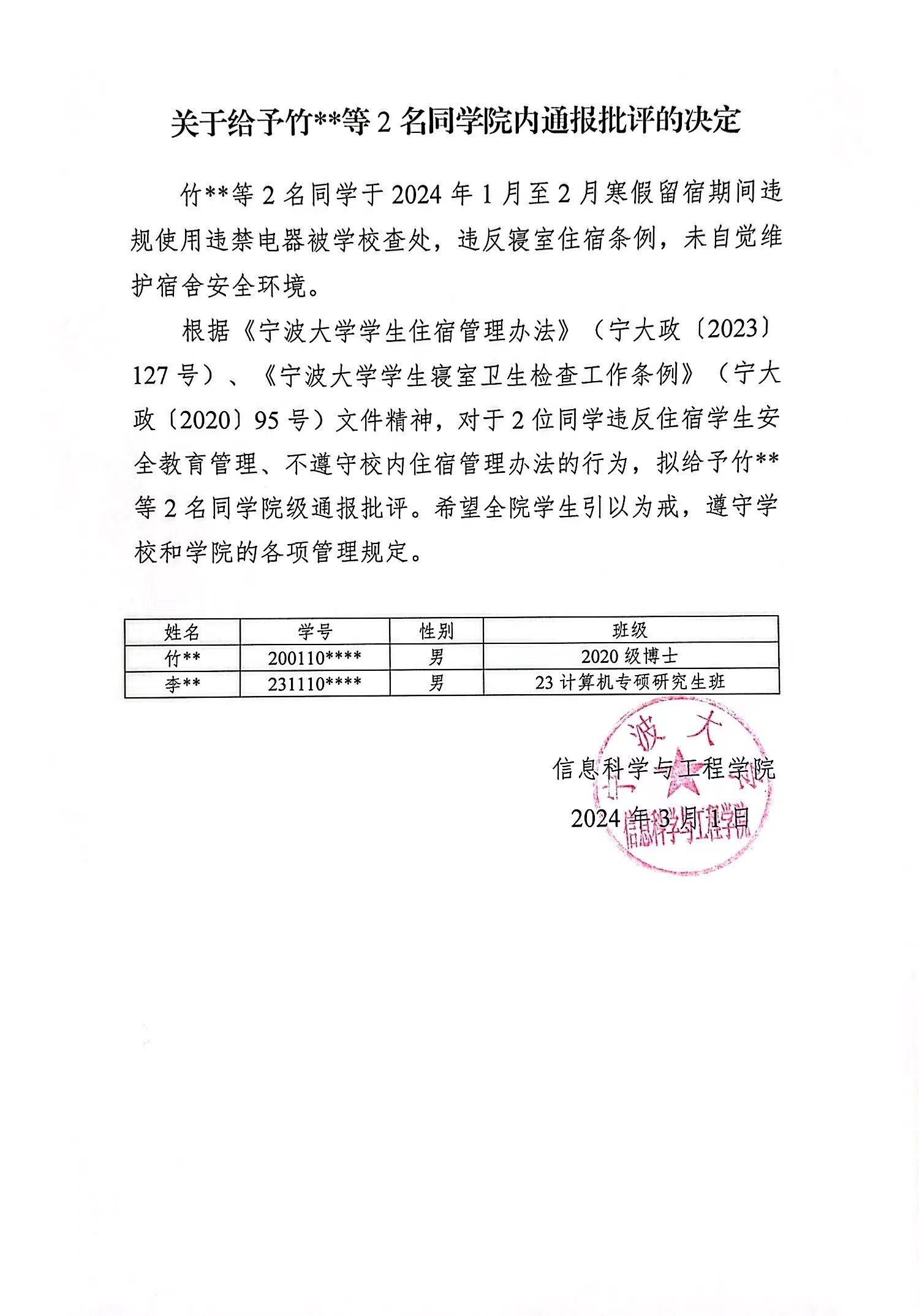 关于给予竹XX等2名同抖音黑料 内通报批评的决定